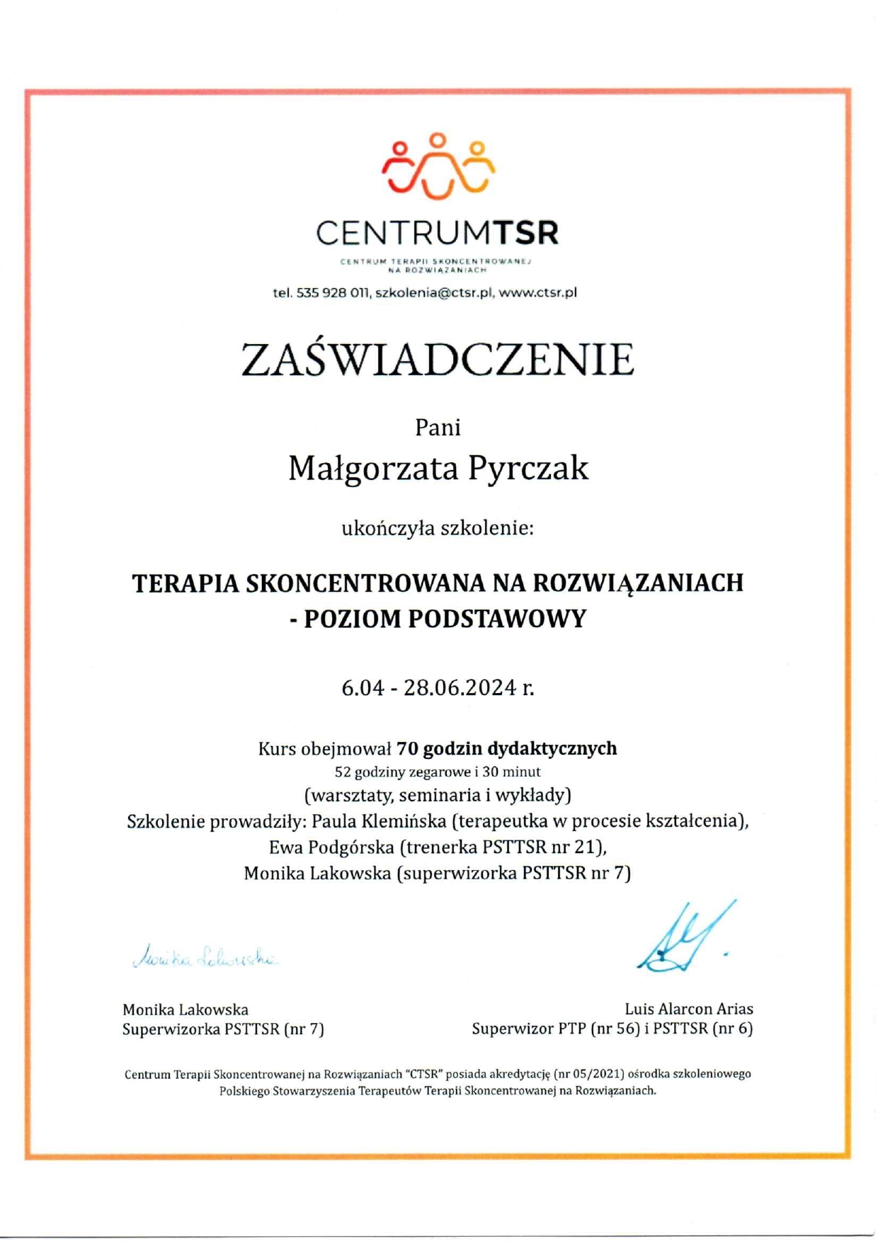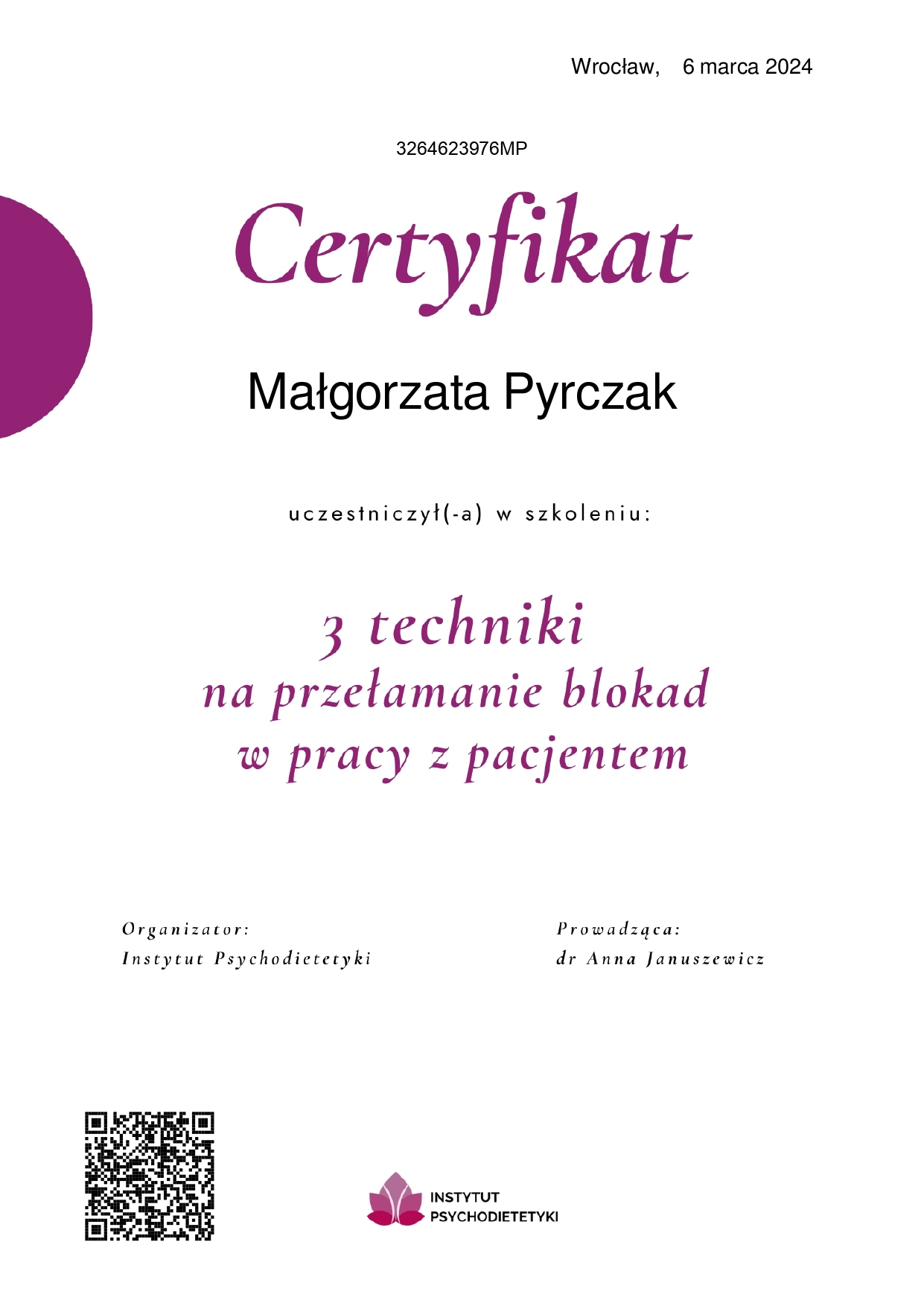 Nazywam się Małgorzata Pyrczak i jestem tutaj, aby wspierać innych w budowaniu zdrowych relacji z jedzeniem i samym sobą. Jako psychodietetyczka wierzę, że nawyki żywieniowe to coś więcej niż tylko dieta – to także nasze emocje, przekonania i sposób, w jaki dbamy o siebie na co dzień. Moją misją jest inspirowanie do zmian, które prowadzą do trwałej równowagi i poczucia satysfakcji. Każde spotkanie z osobą poszukującą wsparcia jest dla mnie okazją, by towarzyszyć jej w drodze do pełniejszego, bardziej świadomego życia.