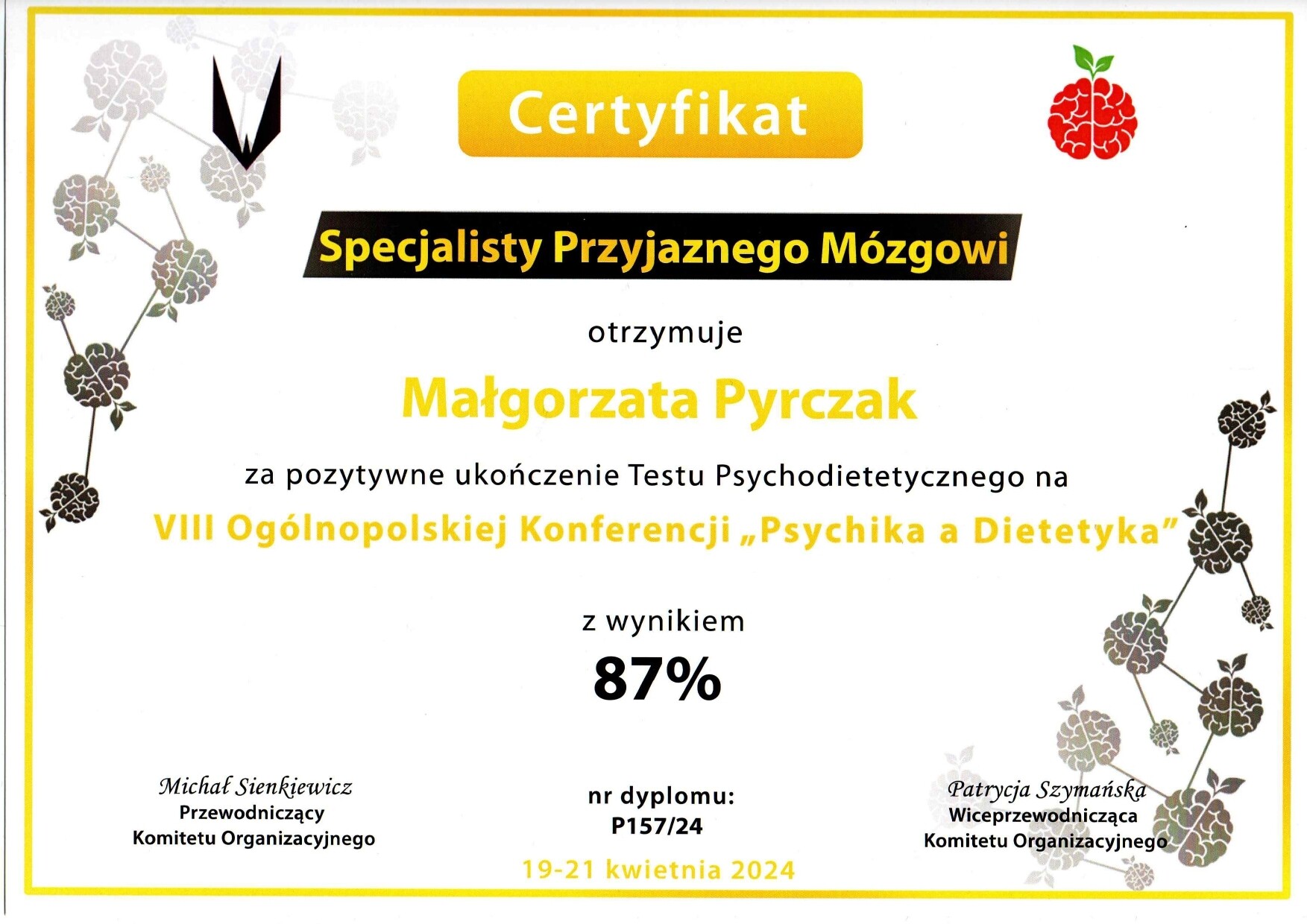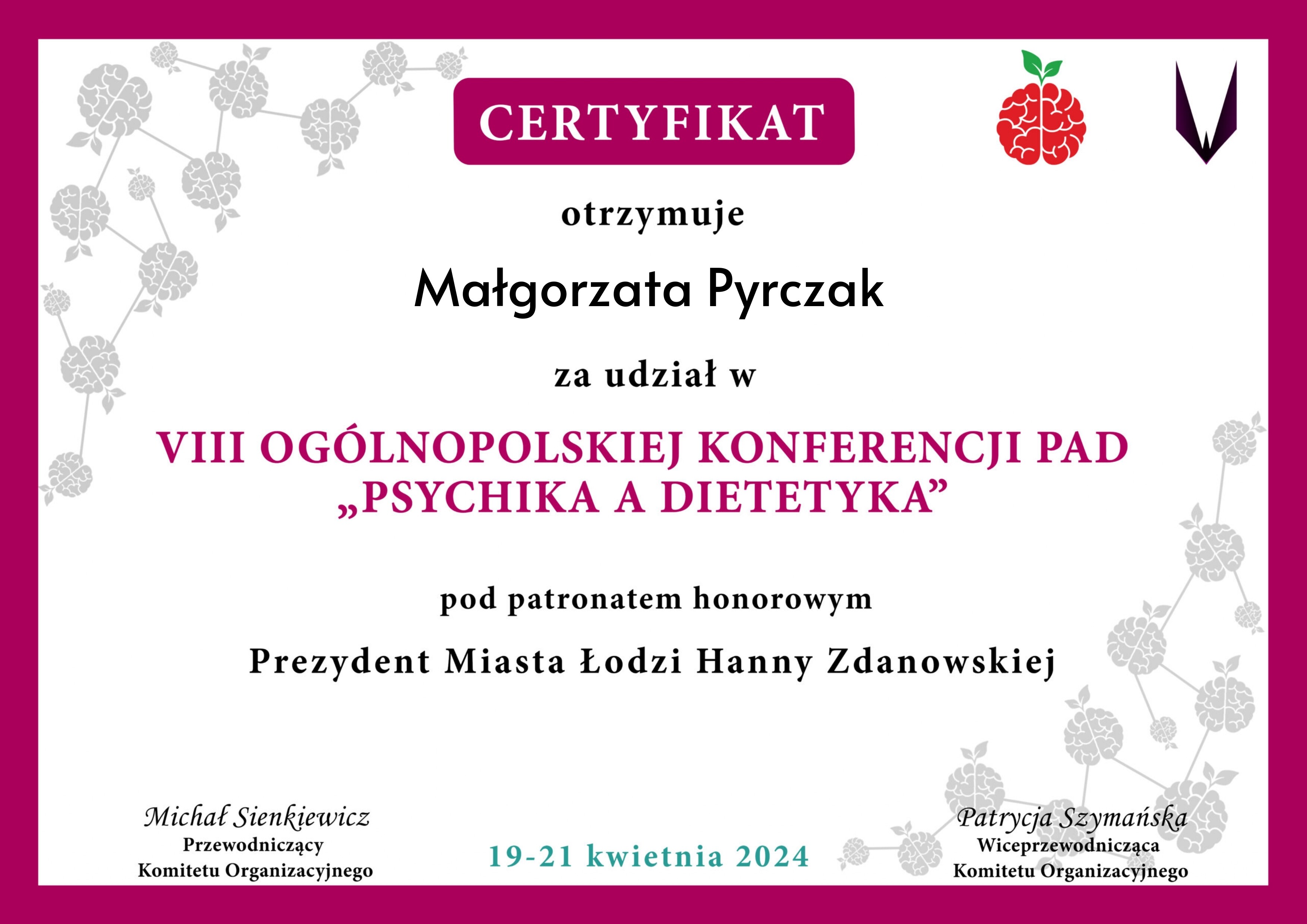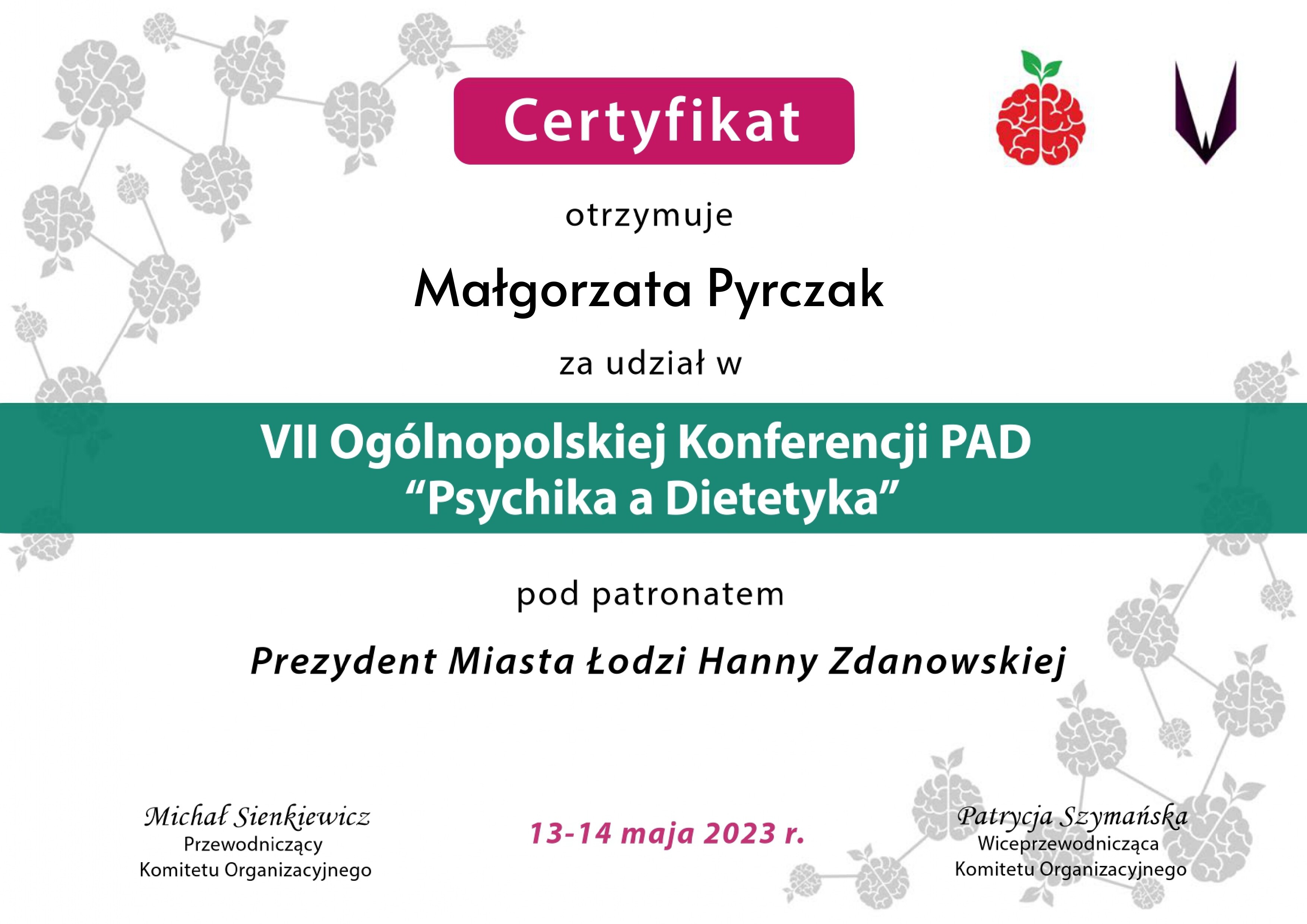 Regularnie uczestniczę w konferencjach naukowych dotyczących dietetyki i psychodietetyki, aby być na bieżąco w mojej pracy z najnowszymi badaniami i metodami.