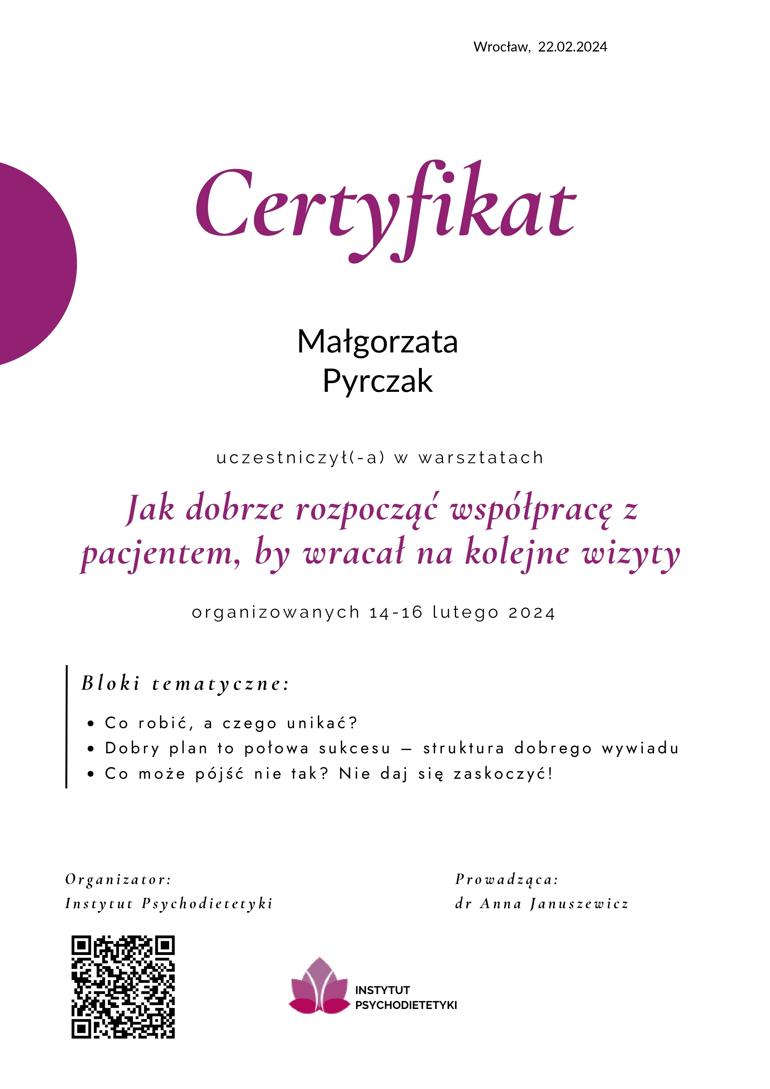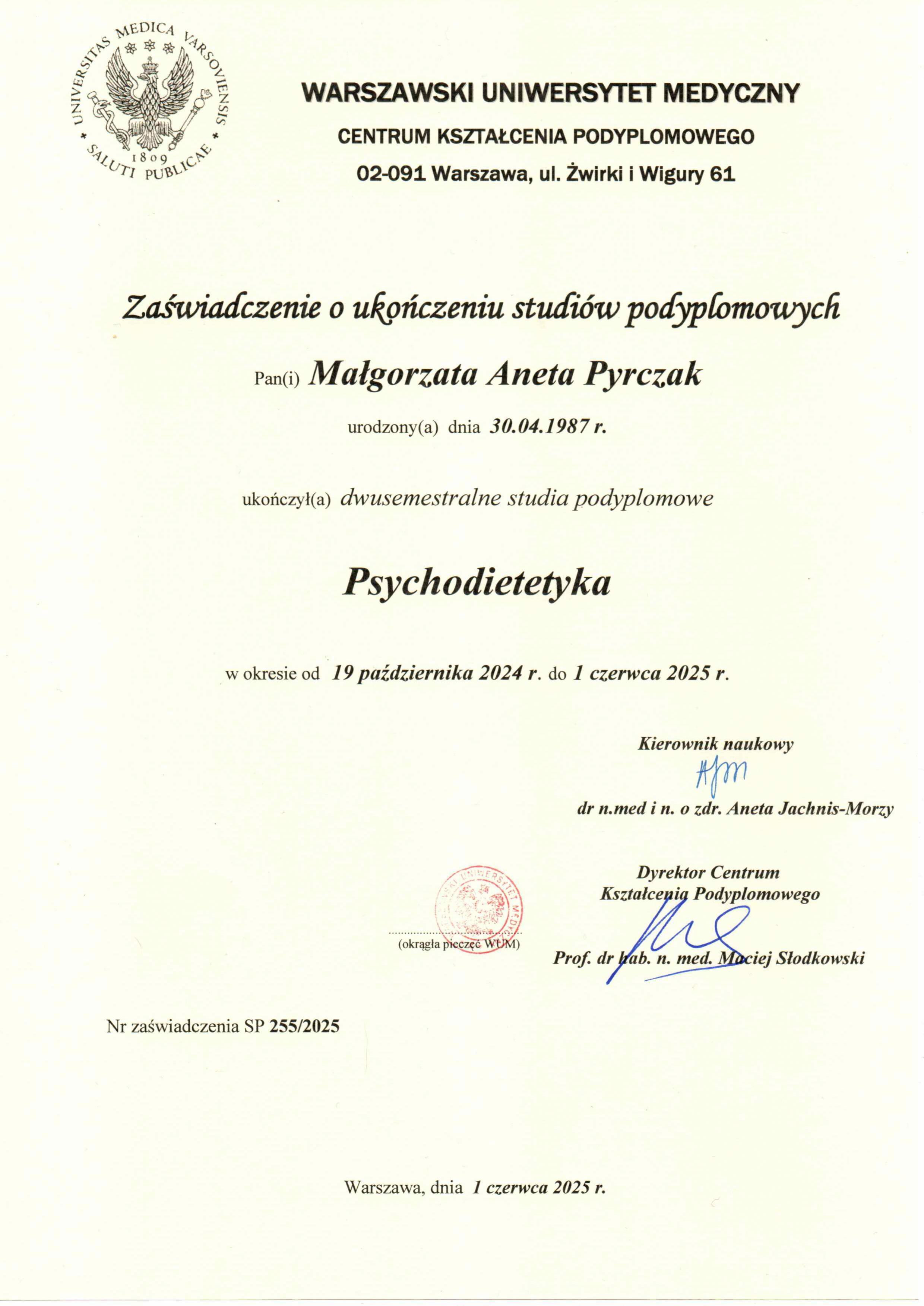 Wcześniejsze studia z psychologii umożliwiły mi lepsze zrozumienie tych zależności. Obecnie rozwijam umiejętności terapeutyczne w nurcie Terapii Skoncentrowanej na Rozwiązaniach (TSR), co pozwala mi bardziej całościowo podejść do problemów żywieniowych moich klientów.